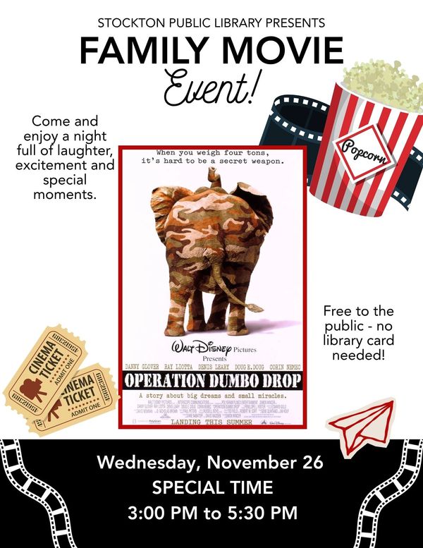Wednesday, November 26th, 3 PM to 5:30 PM (Special Time) - Family-friendly movie: Operation Dumbo Drop.