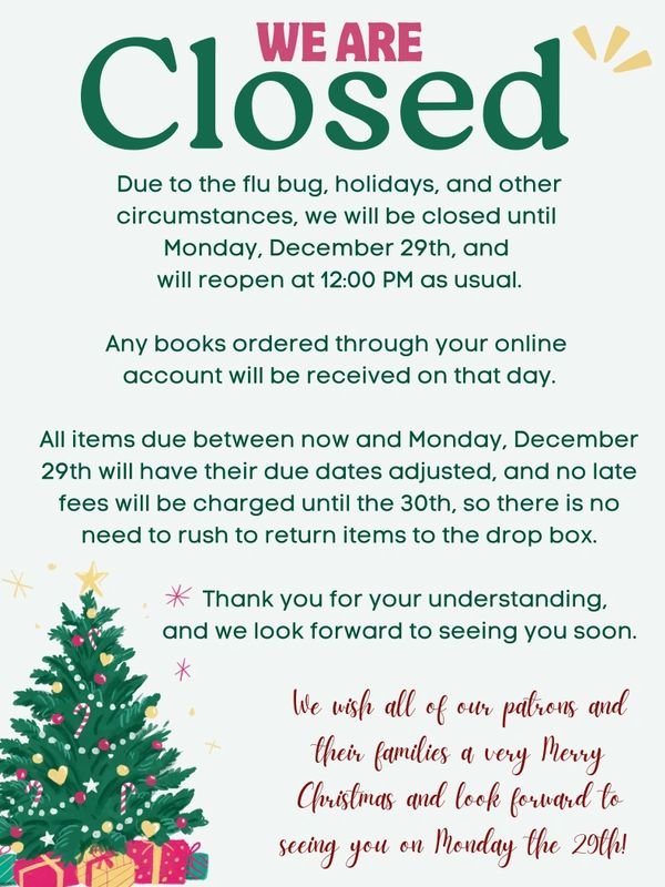 All items due between now and Monday, December 29th will have their due dates adjusted, and no late fees will be charged until the 30th, so there is no need to rush to return items to the drop box.