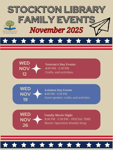 Wednesday November 12 - Veteran's Day Program with guest speaker, lesson, crafts, and activities!